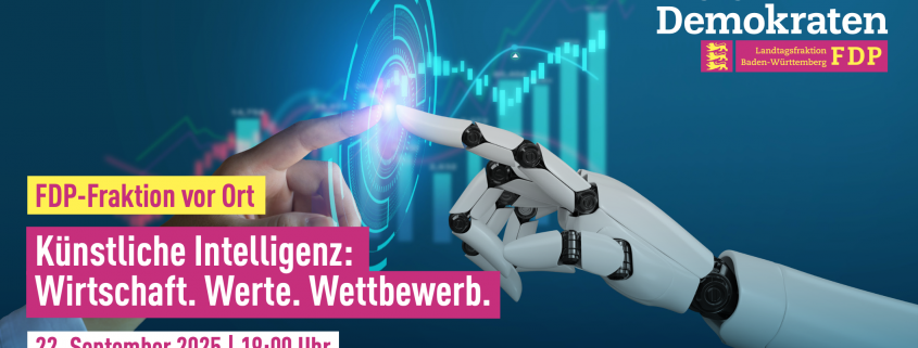 Ein kurzer Impulsvortrag gefolgt von einer Podiumsdiskussion mit Teilnehmern aus der Industrie, von der Wissenschaft und der Politik. Anwesend sein werden unter anderem: Hans-Ulrich Rühlke MdL, Vorsitzender der Fraktion der FDP im Landtag, Prof. Dr. Erik Schweickert MdL, Dr. Martin Kremmer, John Deere Manager Ag VDV und Honrary Professor am KIT. und Sarah Ball, Doktorandin an der Ludwigs-Maximilian-Universität Münschen (LMU) Diskutiert werden: die rasante Entwicklung von KI, die Auswirkungen hiervon auf Industrie, Gewerbe, Handwerk, Freiberufler, Bildung, … und gesellschaftliches Zusammenleben. Anmeldung hier: https://fdp-landtag-bw.de/events/